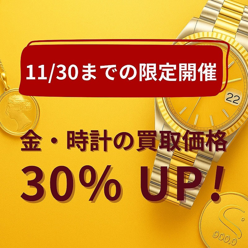 ただいま、金製品と腕時計を対象とした買取金額30%アップキャンペーンが大好評開催中です💰